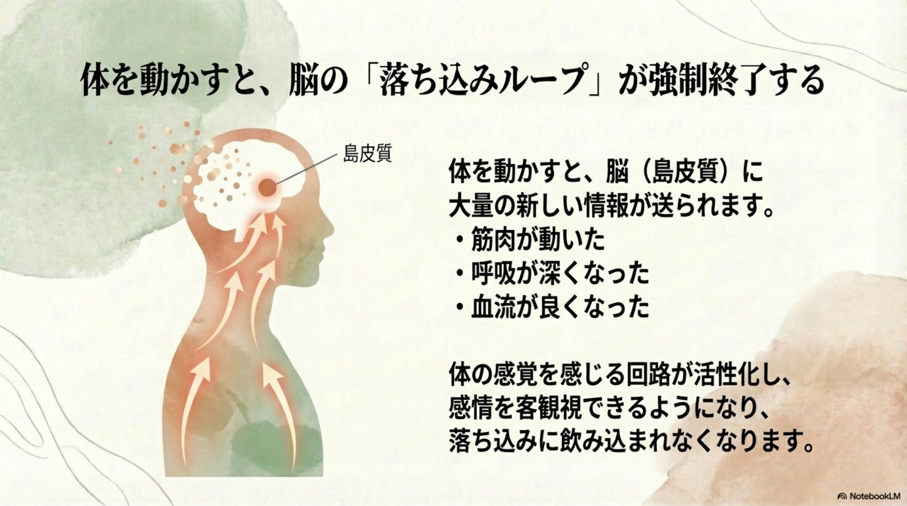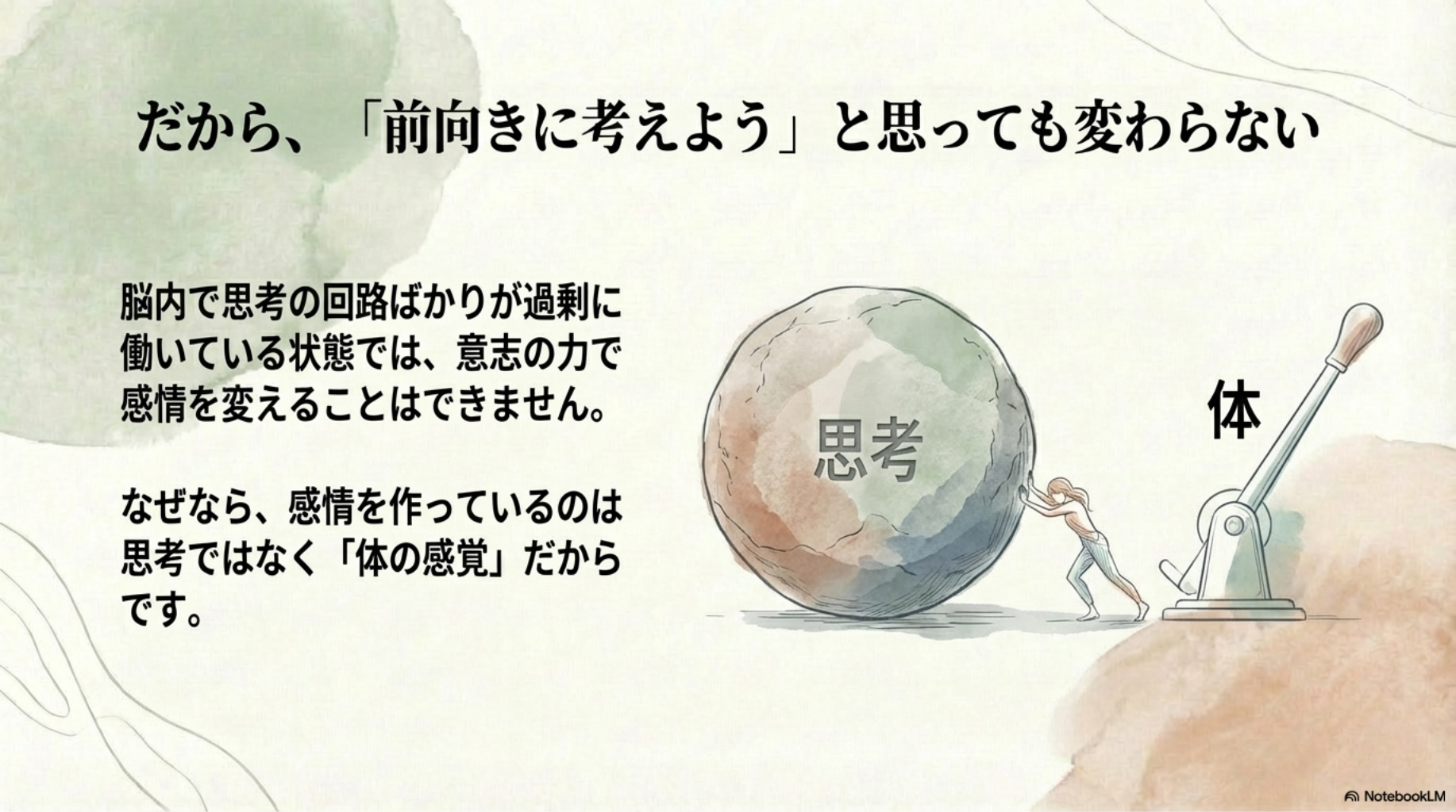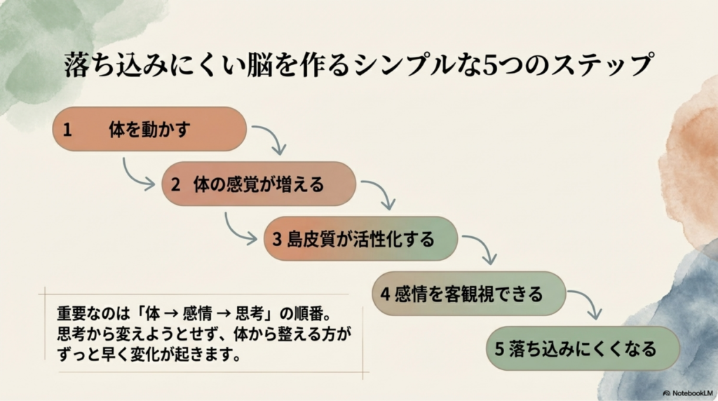 思考だけを変えようとしても、感情は変わりにくいです。体の感覚を整えることが重要です。